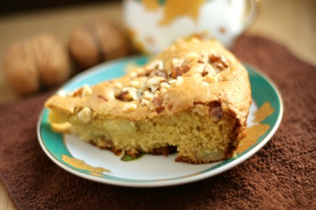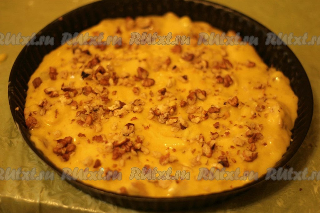 Выложить тесто в форму для выпечки, смазанную сливочным маслом, по желанию, посыпать сверху достаточно мелко нарезанными грецкими орехами.