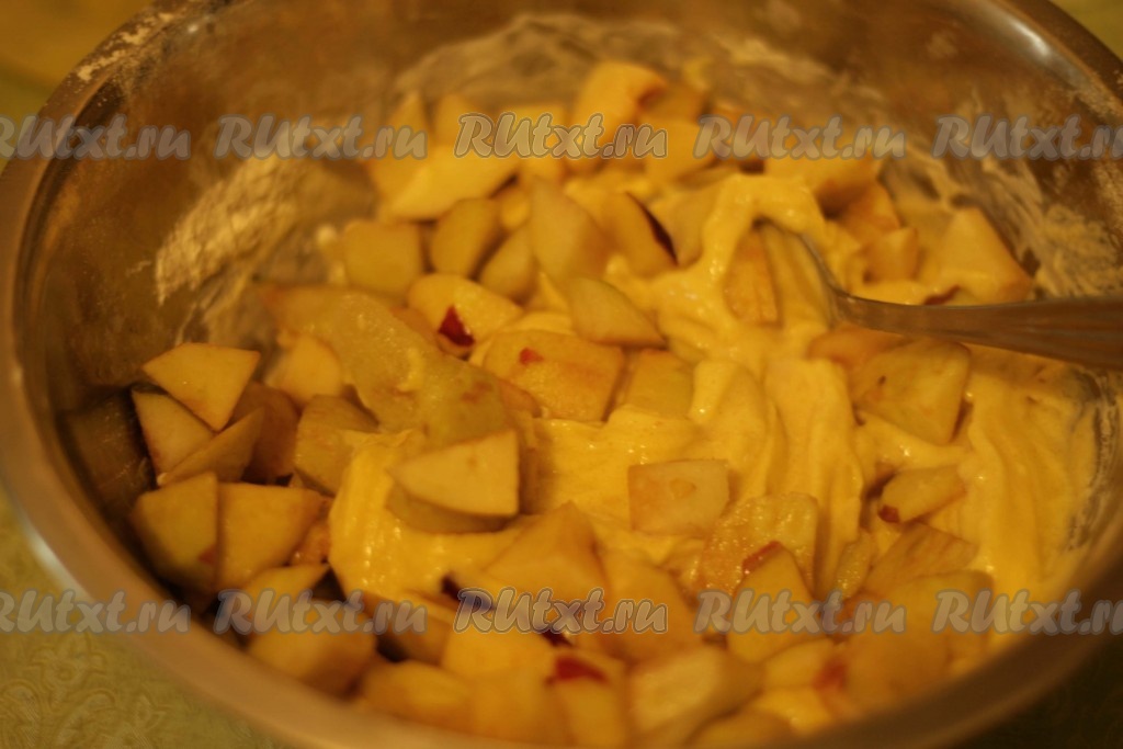 Добавить яблоки в тесто. Аккуратно перемешать, равномерно распределяя фрукты по всему тесту.