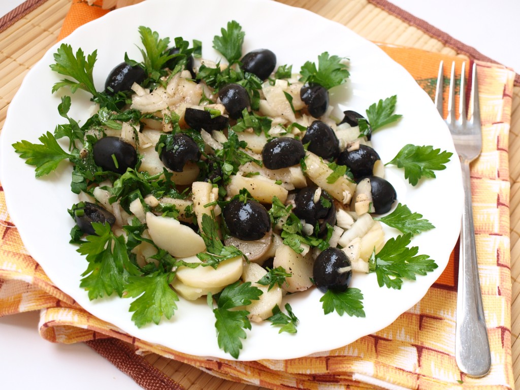 Картофельные салаты очень популярны в немецкой кухне. Многие из них заменяют гарниры и хороши как самостоятельное блюдо. Предлагаю один из рецептов немецкого салата с картофелем, луком и маслинами.