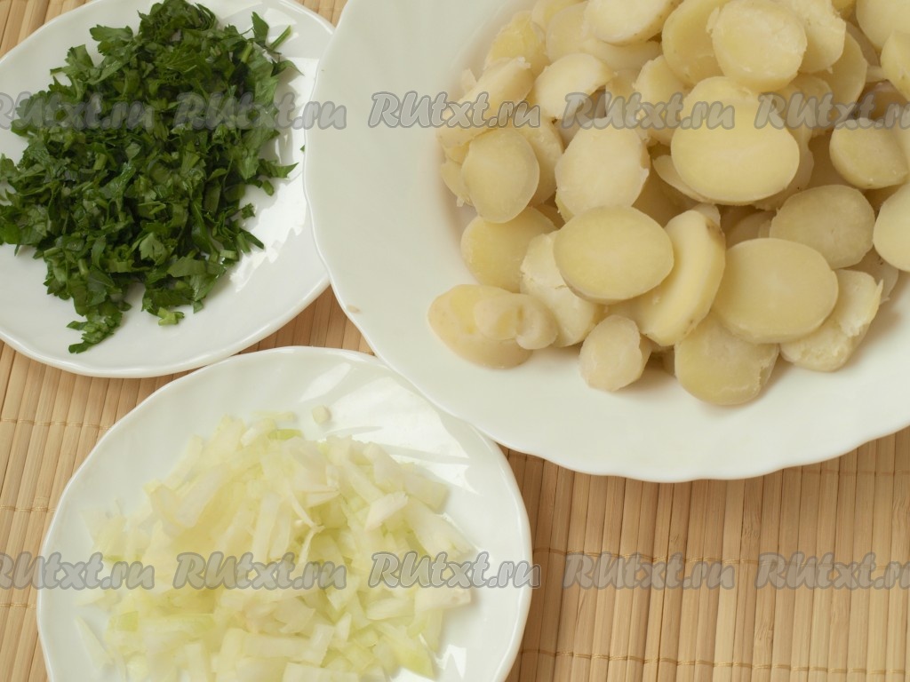 Для этого немецкого салата лучше взять мелкий картофель. Сварить его в мундире, остудить и очистить. Нарезать картофель толстыми кружочками, измельчить петрушку и лук.