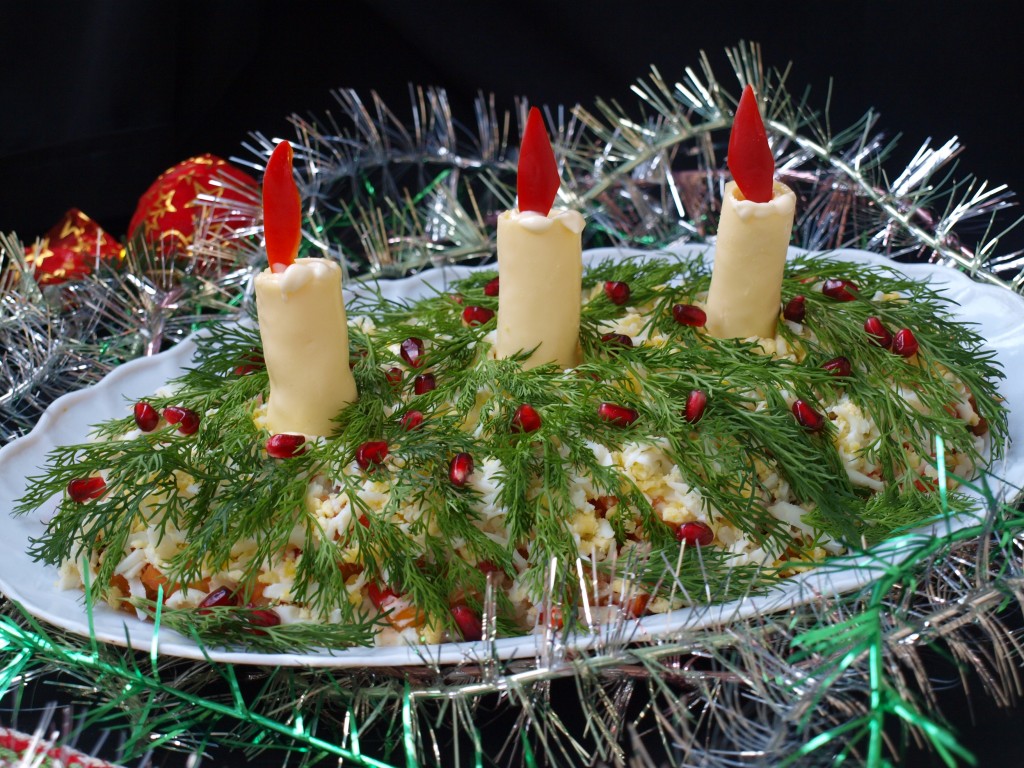 Салат посыпаем натёртыми яйцами, в ряд ставим подготовленные сырные свечи, в центр каждой свечки вставляем огонь из перца. Покрываем верх салата маленькими веточками укропа и посыпаем гранатовыми зёрнами. Яркий, вкусный салат "Рождественские свечи" можно подавать к столу.