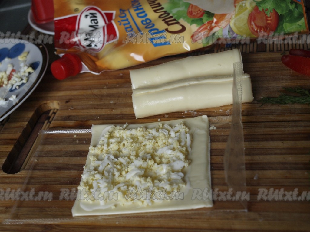 Пластинки сыра слегка смазываем майонезом, посыпаем яйцами и сворачиваем в трубочки - это будут свечи.