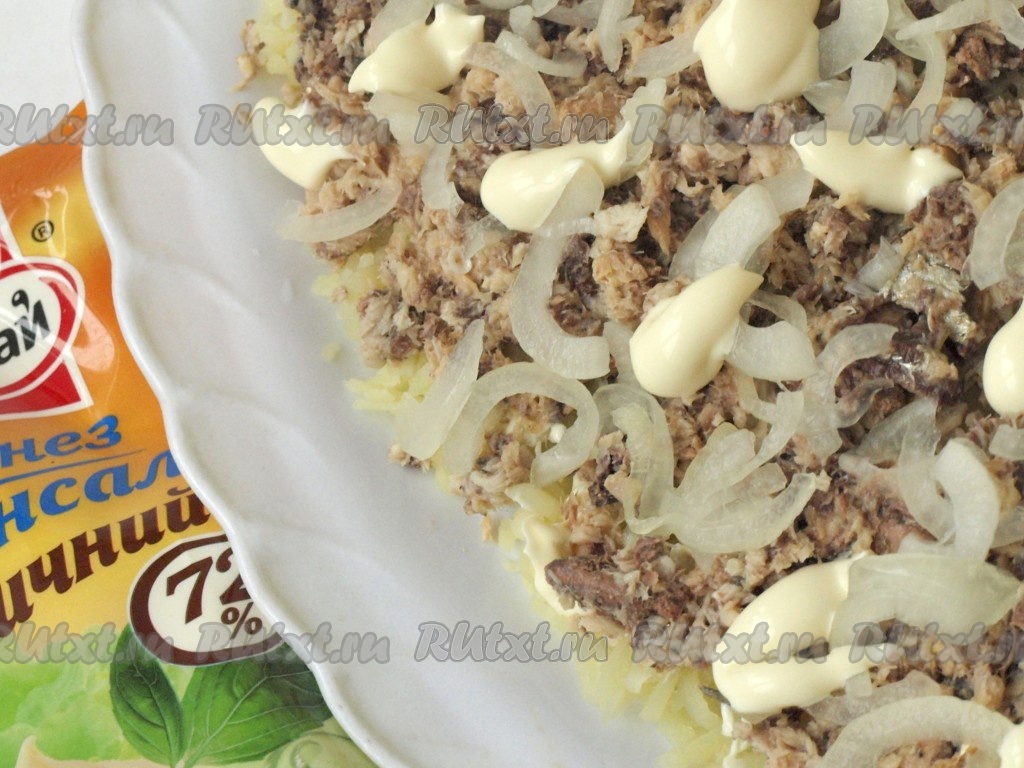 С рыбных консервов сливаем масло и разминаем вилкой, выкладываем поверх картофеля. Лук, нарезанный полукольцами, маринуем в уксусе, промываем холодной водой. А затем выкладываем лук поверх консервов, смазываем слегка майонезом.