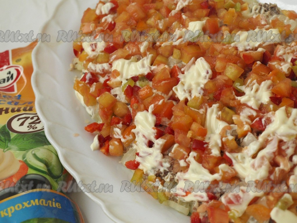 Из болгарского перца сразу вырезаем язычки огня, оставшийся перец и помидоры нарезаем мелкими кубиками. Смешиваем порезанные помидоры и перец, выкладываем следующим слоем, солим, смазываем майонезом.