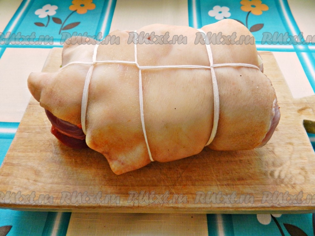 Свиную рульку свернуть в рулет, начиная с узкой стороны, затем связать прочной нитью (или шпагатом).