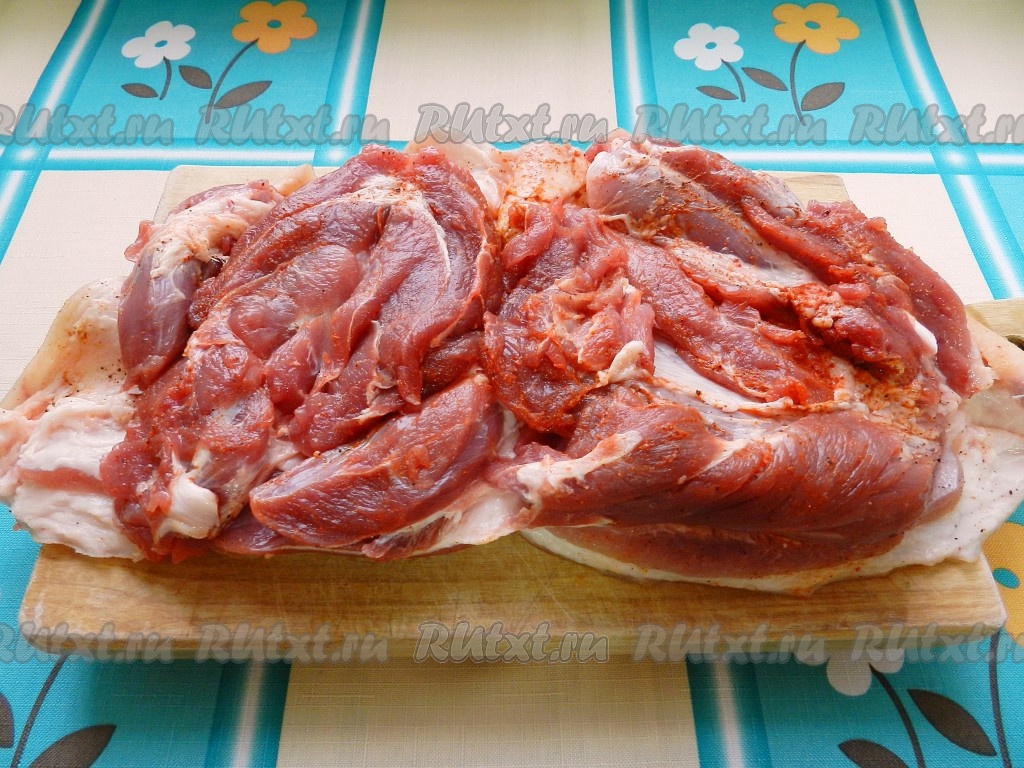 Свиную рульку тщательно вымыть, поскоблить кожу ножом. Затем сделать надрез и удалить кость. Выложить мясо кожей вниз, затем посолить, поперчить, присыпать паприкой, втереть специи в мясо руками.