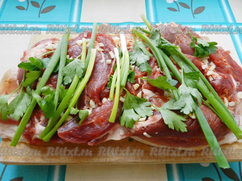 Зубчики чеснока очистить. Зелёный лук и петрушку промыть водой и обсушить. Присыпать мясо рубленным чесноком, выложить лук и петрушку.