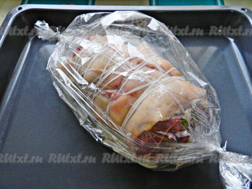 Готовый рулет вынуть из рукава, полностью остудить, снять нитки, а затем можно его нарезать и подавать к столу.