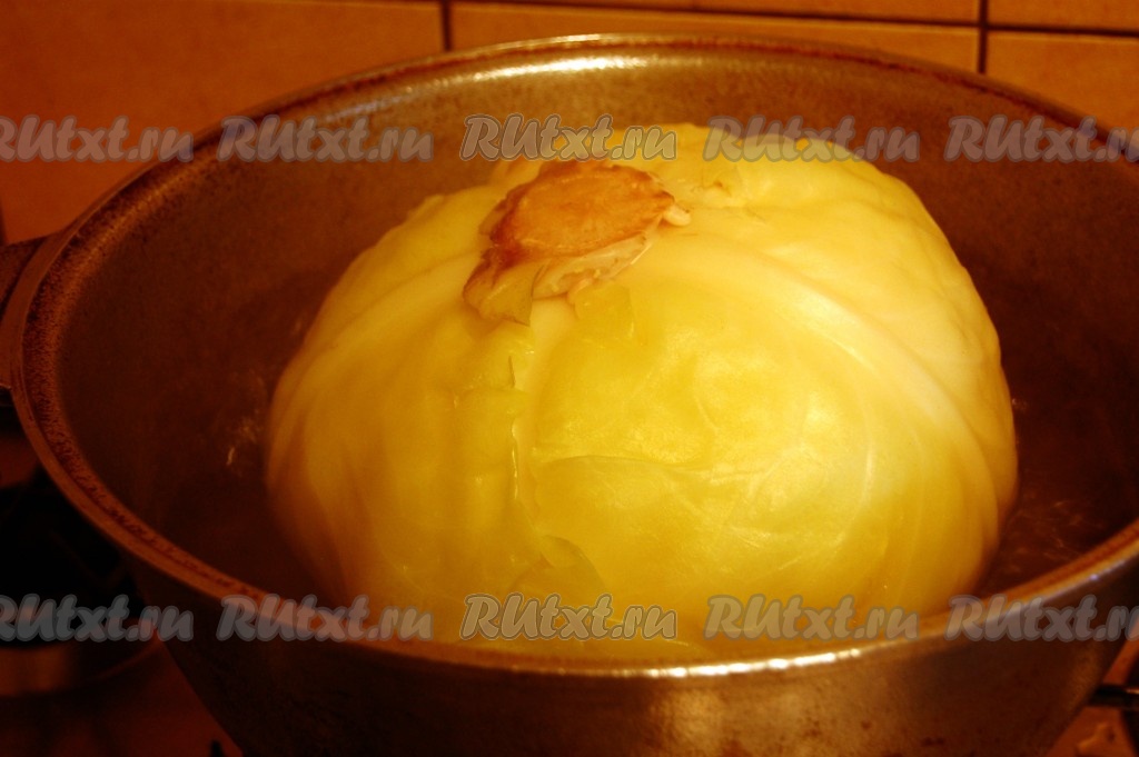 Взять большую кастрюлю, выложить в неё целиком кочан капусты, залить полностью горячей водой и поставить на достаточно сильный огонь. После закипания воды уменьшить огонь до ниже среднего.