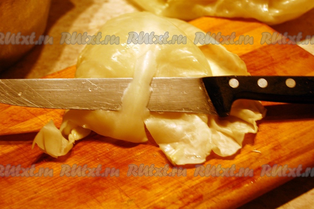 Минут через 15 после закипания воды достать кочан и осторожно снять первые листья, ставшие достаточно мягкими. Кочан с оставшимися листьями снова отправить в кастрюлю и продолжить варить. Минут через 10 снять ещё листья, ставшие достаточно мягкими. И так далее продолжать отваривать кочан капусты, пока не останется совсем немного некрупных листьев, которые не подойдут для приготовления голубцов (листья, не подошедшие для приготовления голубцов, отложите в сторону, они нам понадобятся в дальнейшем для запекания голубцов в духовке). Остудить листья, снятые с кочана, которые подходят для приготовления голубцов.
