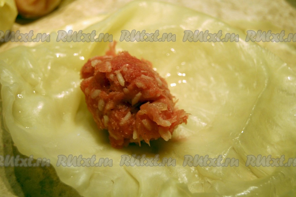 Ближе к центру капустного листа выложить часть получившегося фарша, завернуть боковые края листа на фарш, а затем свернуть капустный лист в рулет, начиная со стороны с начинкой.