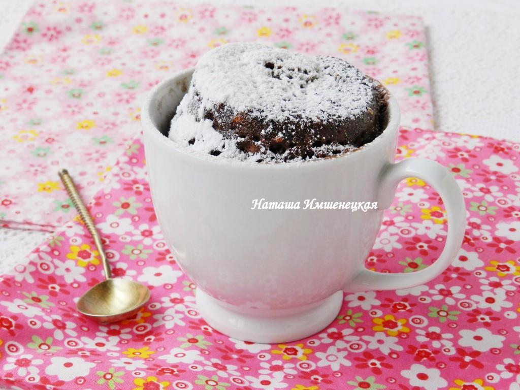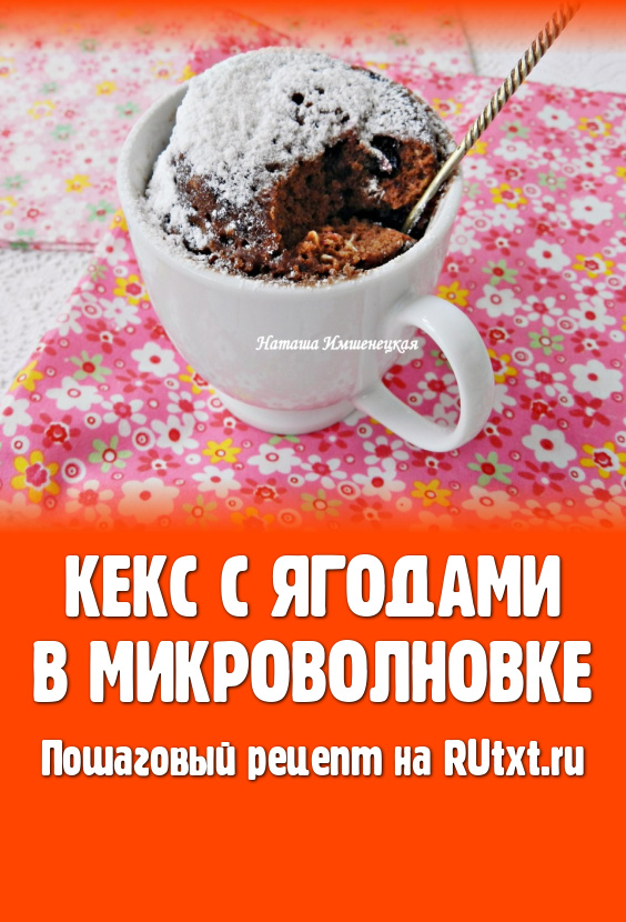 Обязательно проверьте кексы с ягодами на готовность, проколов их сухой зубочисткой (если зубочистка после прокалывания кексов остаётся сухой, значит выпечка готова, сразу вынимайте кружки из микроволновки). Если кексы не готовы, тогда выставляйте таймер на 30 секунд и опять проверяйте готовность. И так продолжайте выпекать до полной готовности кексов. Мне на выпечку кекса до готовности потребовалось 4 минуты, но микроволновки у всех разные.