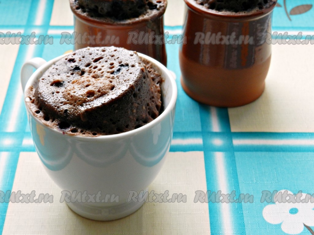Разложить тесто по кружкам, пригодным для приготовления в микроволновой печи. Заполнять кружки тестом нужно не более, чем на половину объёма, так как кексы при выпечке в микроволновке очень сильно поднимаются. Поставить кружки с тестом в микроволновку на 3 минуты при мощности 900 Ватт.