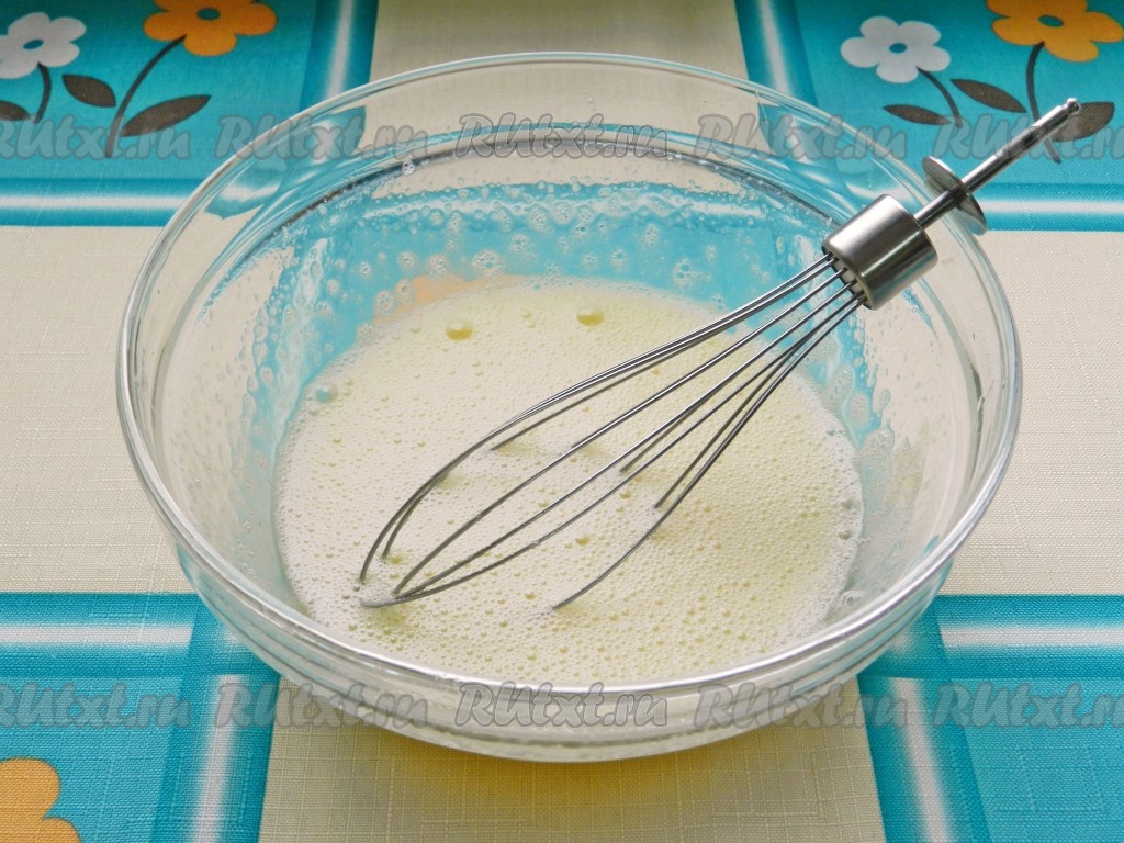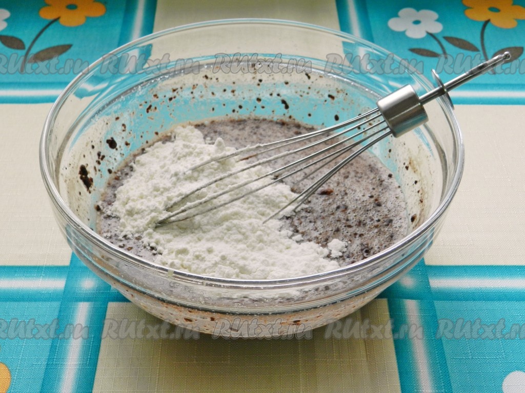 Добавить разрыхлитель и 2 столовых ложки муки, перемешать, чтобы не было комков. Затем, ориентируясь на консистенцию теста, понемногу добавлять муку. Тесто должно получиться, как достаточно жидкая сметана. У меня нужная консистенция теста получилась после добавления 4 столовых ложек муки.
