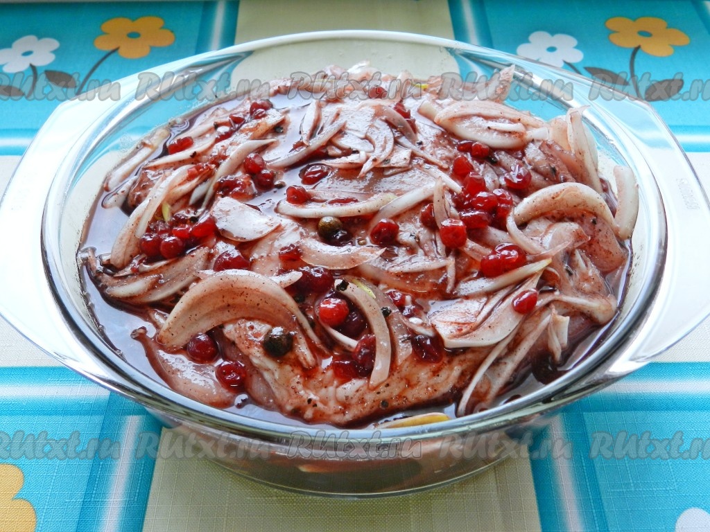 Этим брусничным маринадом залить свинину и оставить на сутки в холодильнике.