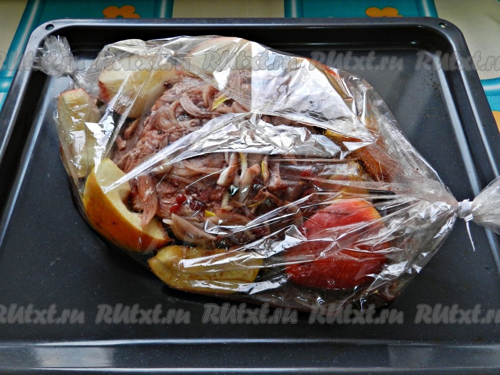 Готовую свинину достать из рукава, аккуратно слить сок вместе с яблоками и луком, душистый перец и лавровый лист удалить.