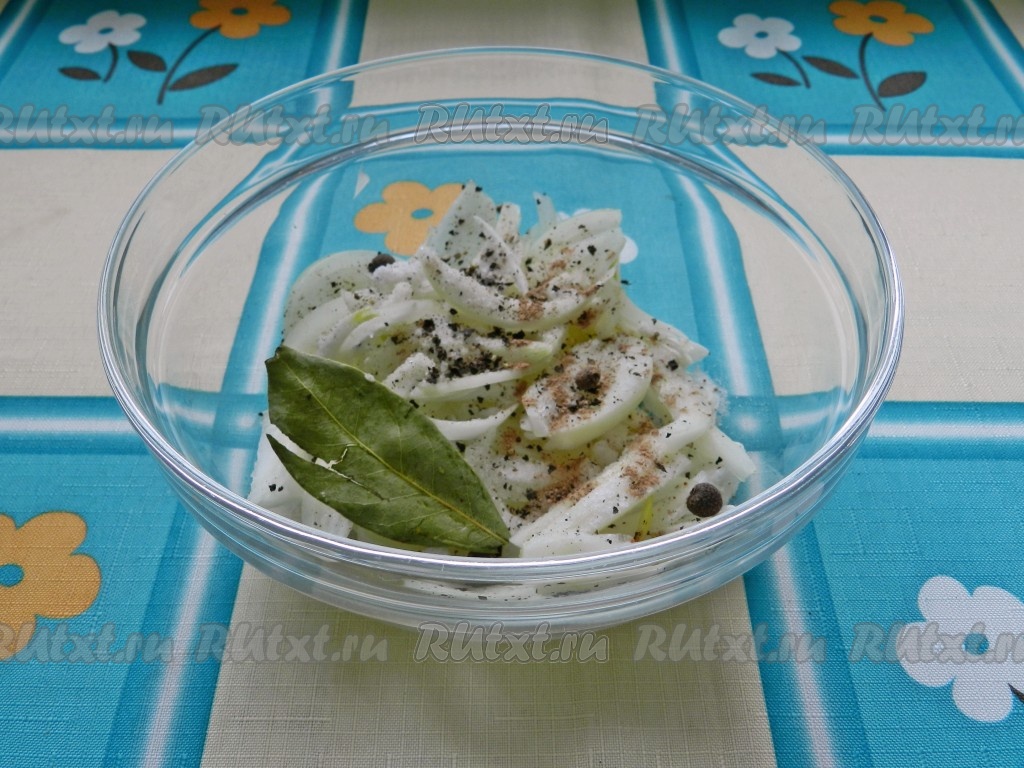 Смешать лук с солью и специями.