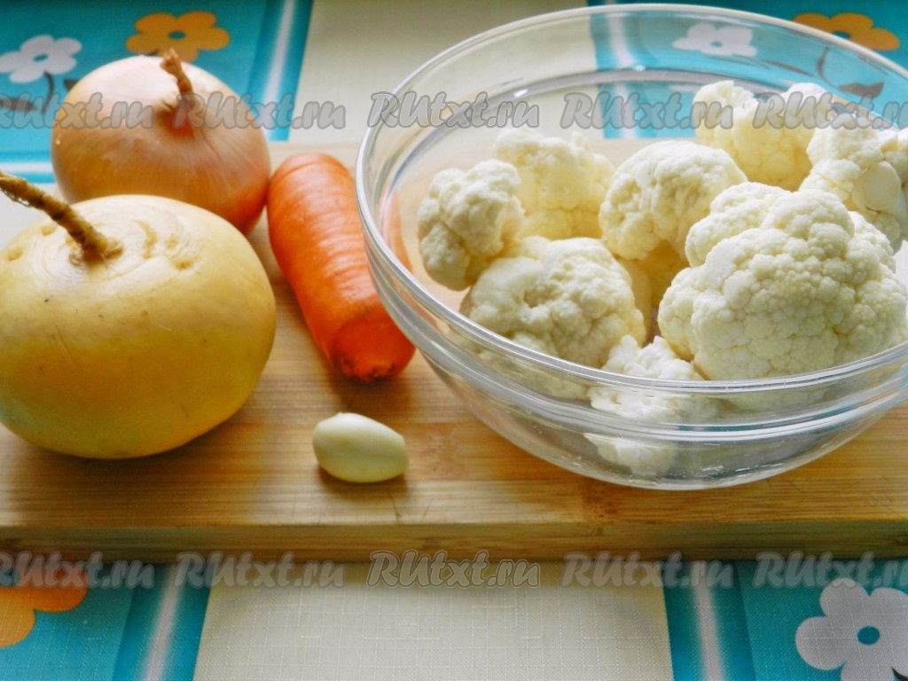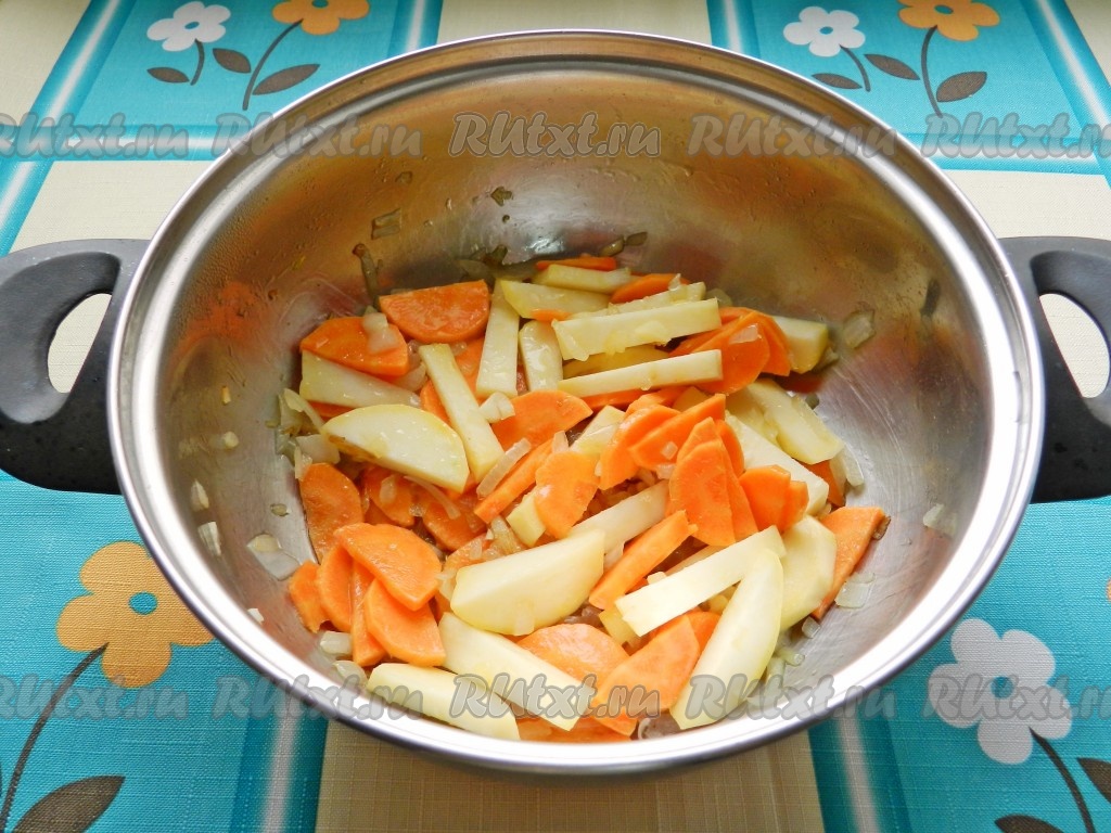 Выложить в кастрюлю морковь и репу, посолить, поперчить по вкусу, влить 1 литр горячей воды и варить 5-7 минут до мягкости овощей.