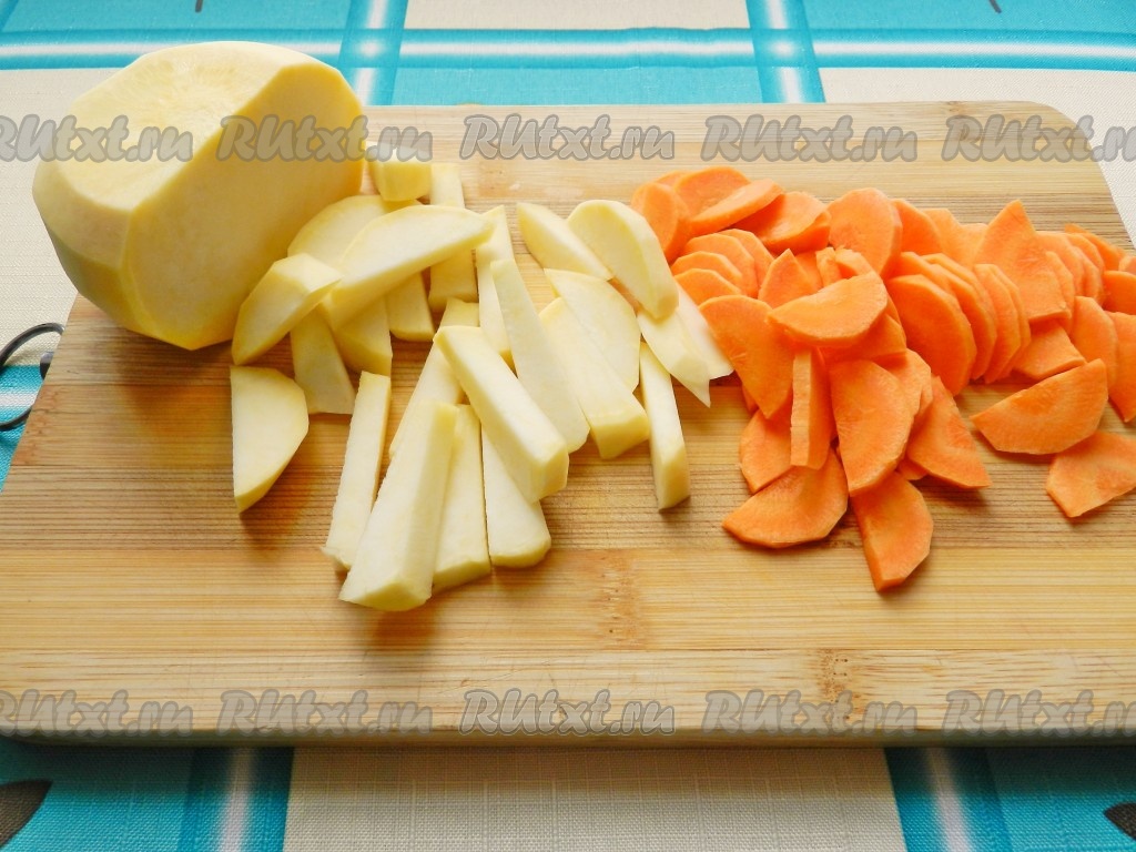 Репу (или картофель) и морковь очистить и нарезать брусочками.