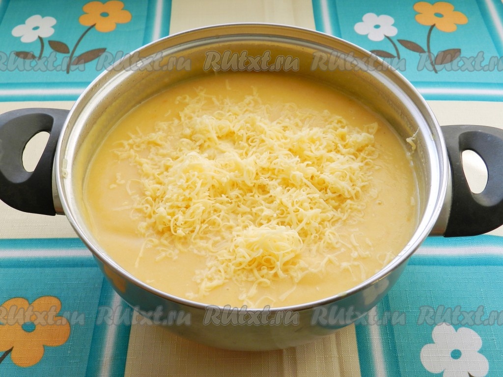 Сыр натереть на терке, добавить в суп. Поставить на медленный огонь и варить, помешивая, пока сыр полностью не расплавится.