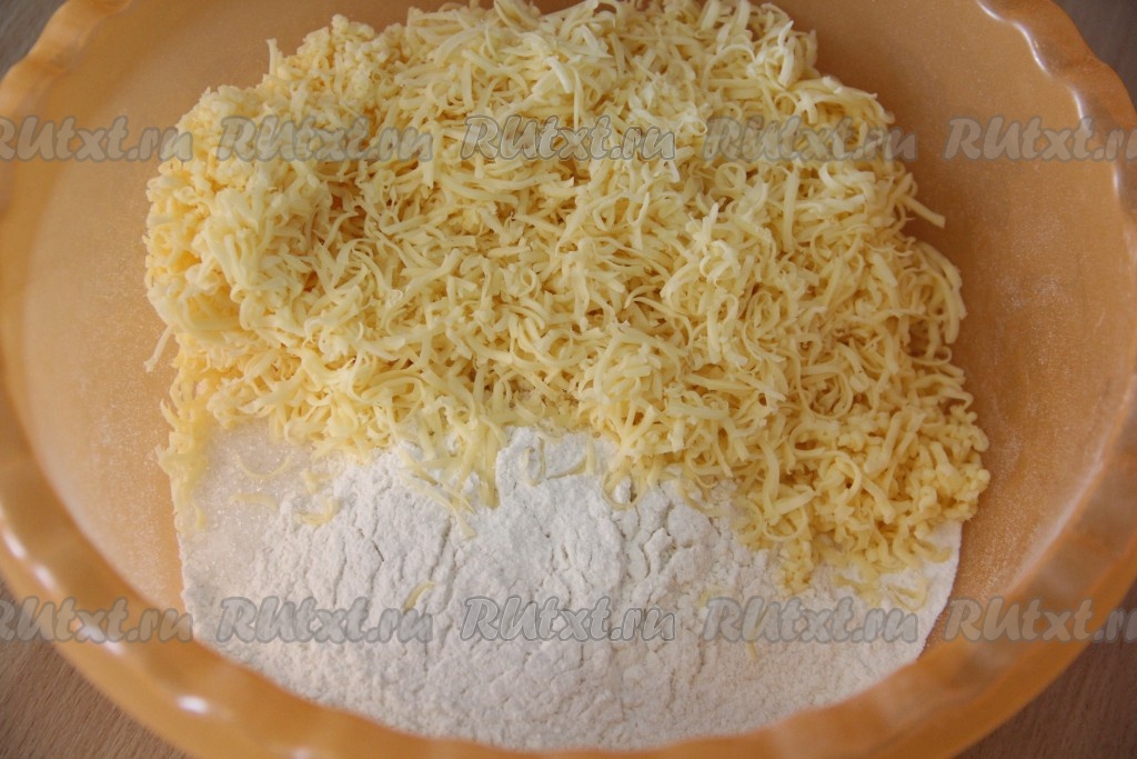 В глубокую миску просеять муку. К муке добавить разрыхлитель, соль, сахар и сыр.