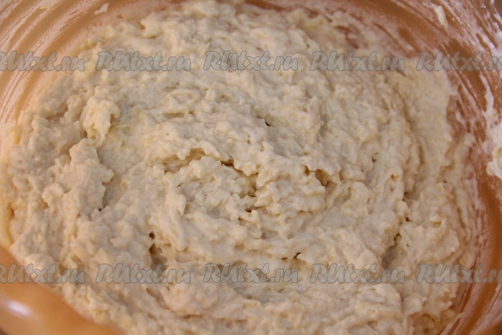 Всё хорошо перемешать ложкой. Тесто получится средней густоты, слегка комковатое. Сильно вымешивать тесто не надо!