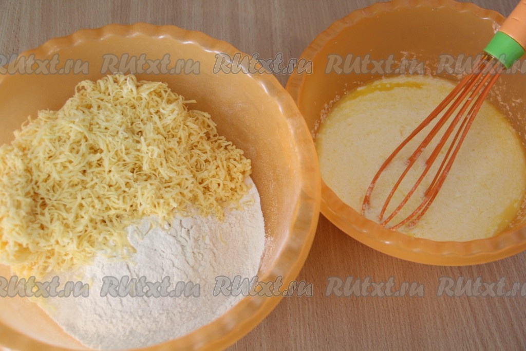 Муку и сыр хорошо перемешать, затем влить жидкую смесь.