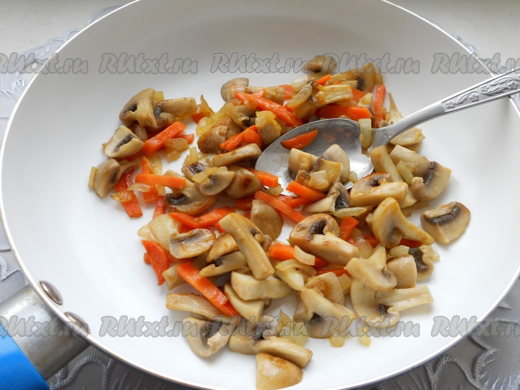 Шампиньоны порезать на 4-6 частей. Обжарить в течение 5 минут на сливочном масле вместе с порезанными небольшими кусочками репчатым луком и морковью.