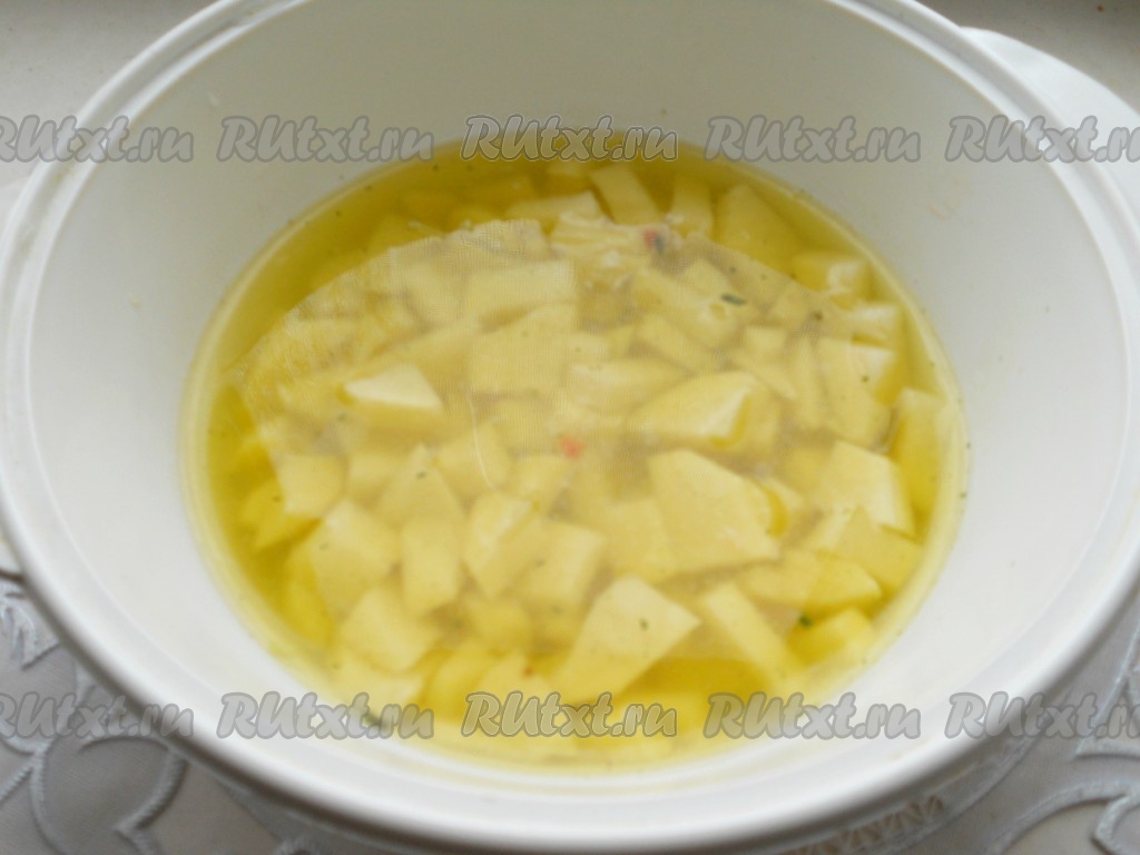 Картофель очистить, помыть и порезать небольшими кубиками. Залить бульоном и поставить на огонь. Довести до кипения, посолить и варить на небольшом огне 15 минут.