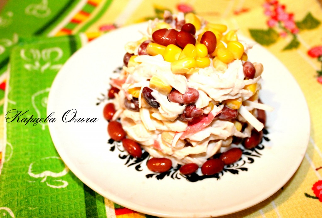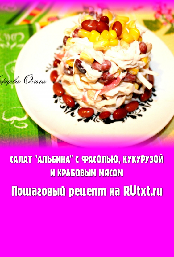 Рецепт этого салатика я увидела в одной из кулинарных передач. Вначале смутило сочетание ингредиентов, но всё равно захотелось попробовать. И не зря! Салат "Альбина" с фасолью, кукурузой и крабовым мясом очень вкусный, сочный и сытный! Всем рекомендую!