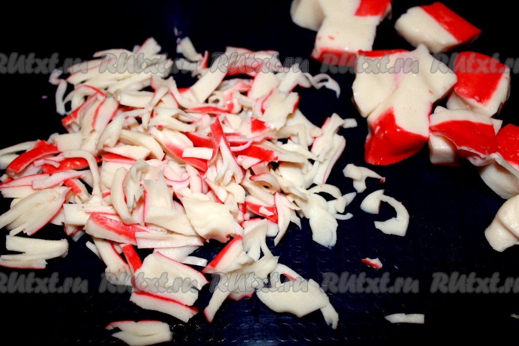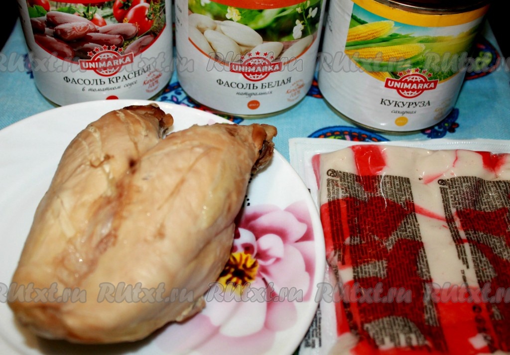 С кукурузы и фасоли слить жидкость и соединить с курицей и крабовым мясом.