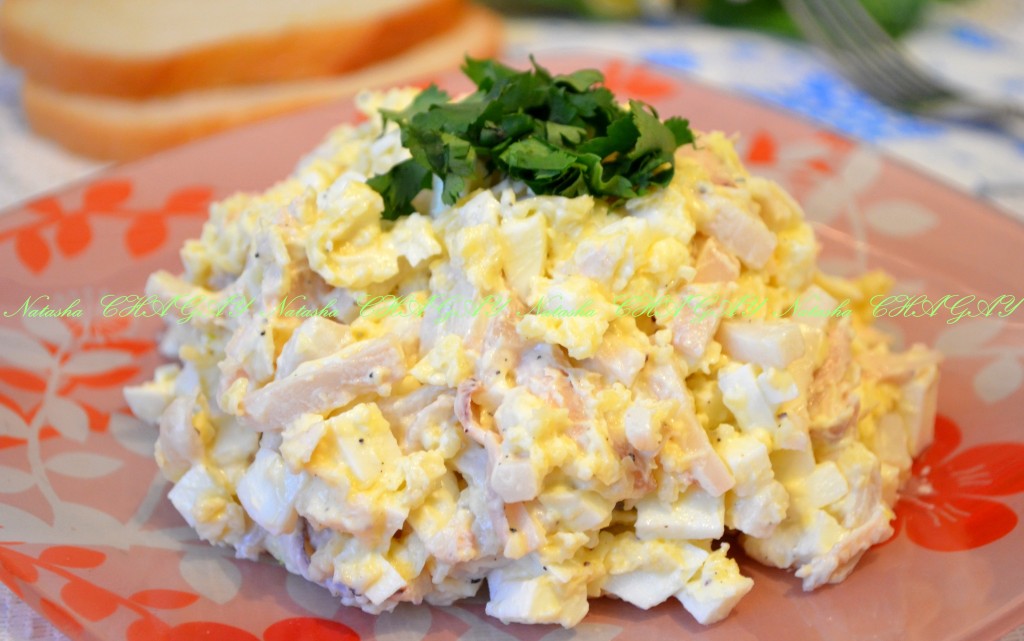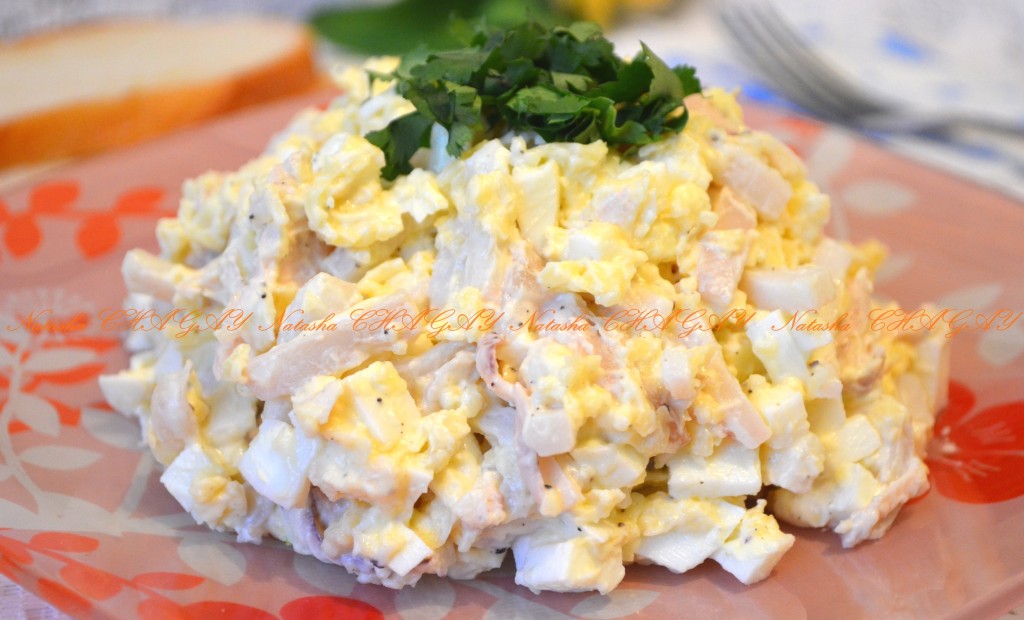 Салат с кальмарами, курицей и сыром по-другому ещё называют "Белковый". Это вкусный, нежный и сытный салат. Он отлично впишется и в ваше повседневное, и в праздничное меню.