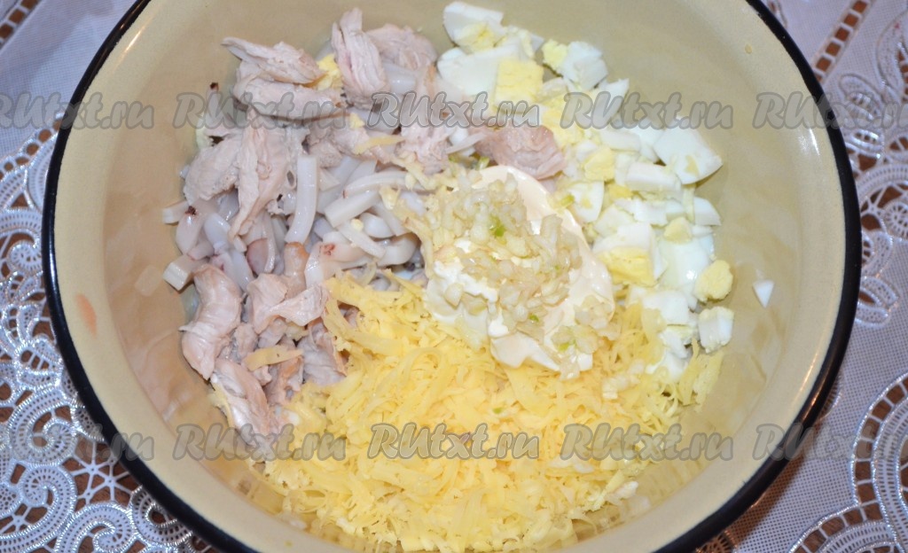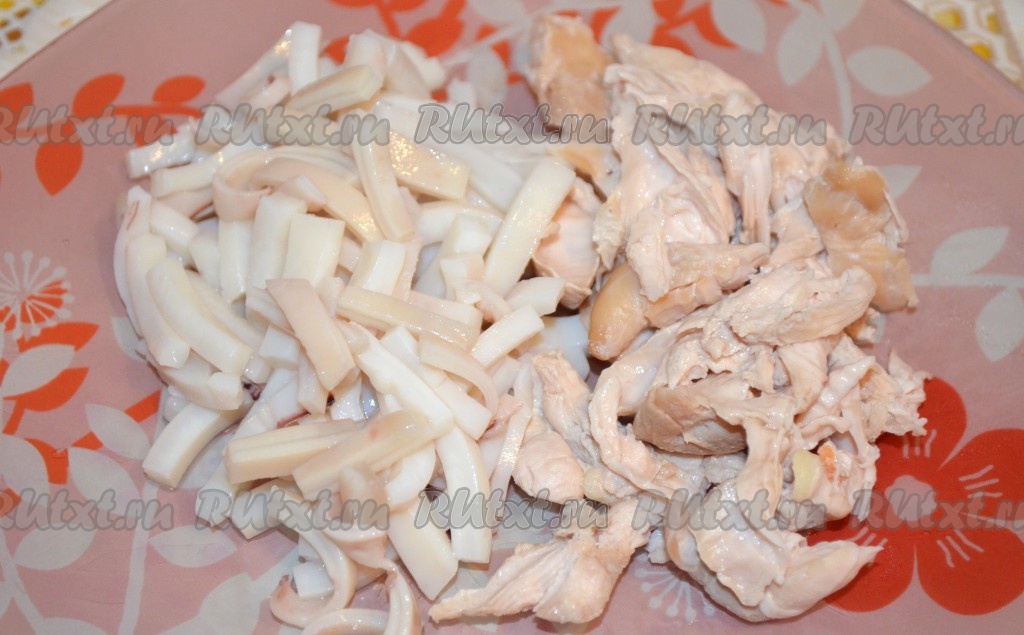Кальмаров полностью разморозить, очистить от плёночки, покрывающих их снаружи, удалить хорду, находящуюся внутри тушки. В кастрюлю с кипящей водой выложить кальмаров, дать воде снова закипеть, после этого варить кальмаров на среднем огне 30 секунд. Сразу достать кальмаров из кастрюли, дать остыть. Заранее отварить куриное филе в течение 25 минут с момента закипания подсоленной воды. Варёное куриное мясо полностью остудить. Кальмаров нарезать мелкой соломкой. Куриное филе разобрать на волокна.