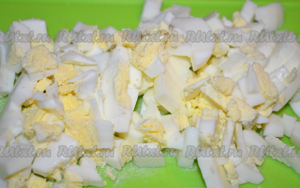 Яйца тоже нужно отварить заранее в течение 10 минут после начала кипения воды, остудить их полностью, очистить, нарезать на небольшие кубики.