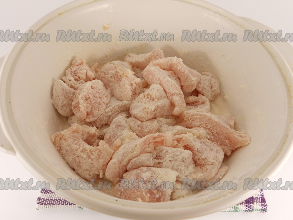 Затем каждый кусочек филе хорошо обвалять в муке со всех сторон.