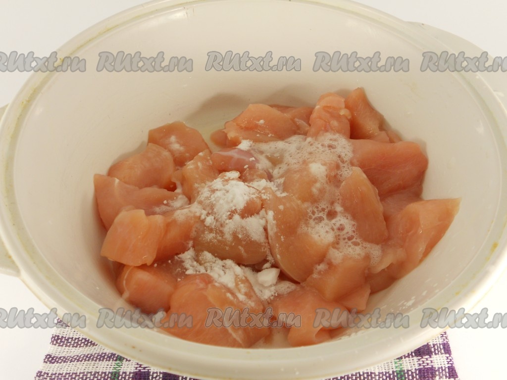 Куриное филе вымыть, обсушить, нарезать на небольшие кусочки толщиной 1 сантиметр. Посолить мясо, добавить соду.