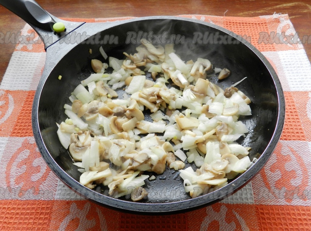Грибы обжарить на небольшом количестве растительного масла до испарения жидкости, добавить нарезанный кубиками репчатый лук и обжарить вместе до золотистого цвета. Выдавить в сковороду чеснок.