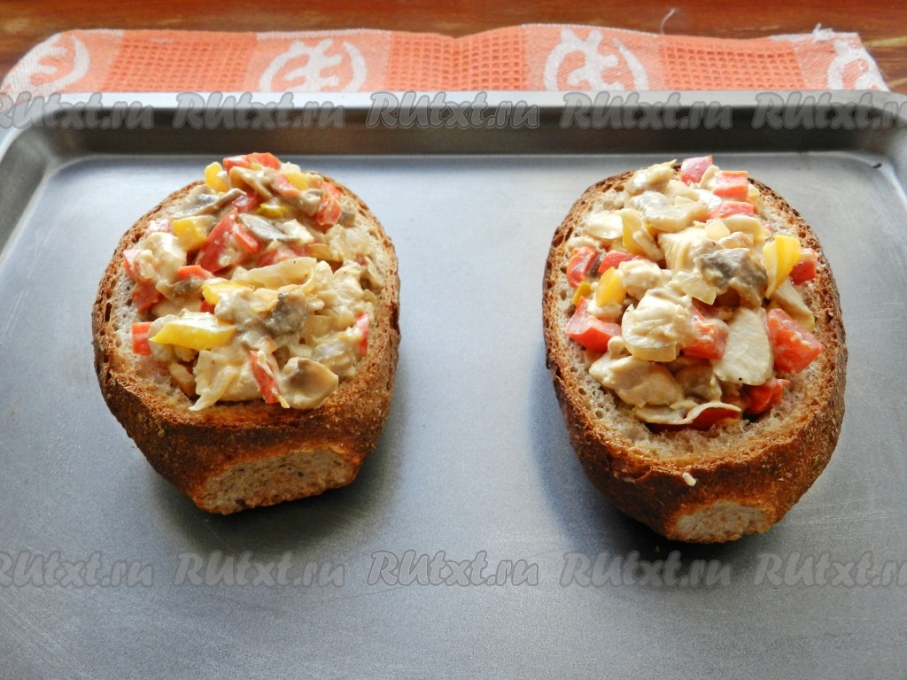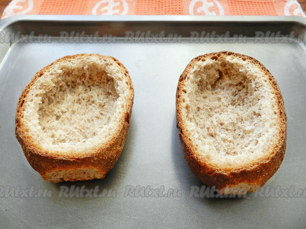 У булочек срезать верхушку и аккуратно, чтобы не повредить стенки, вынуть мякиш. Неиспользованные остатки хлеба можно использовать для приготовления котлет или приготовить панировочные сухари.