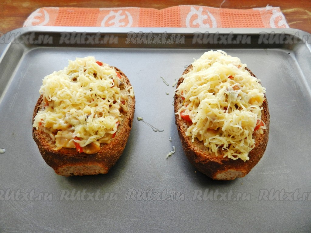 Натереть сыр на терке. Булочки с начинкой достать из духовки, обильно присыпать сыром и вернуть в духовку на 3 минуты, уменьшив температуру до 150 градусов.