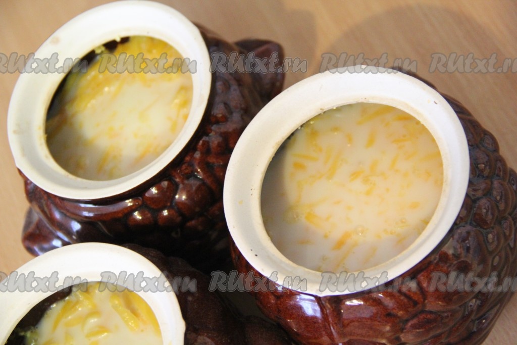 Соединить молоко, воду, соль и сахар. Всё хорошо перемешать. Залить содержимое горшочков молочной смесью, закрыть горшочки крышками и поставить в разогретую духовку. Готовить кукурузную кашу с тыквой 1 час при температуре 170 градусов.