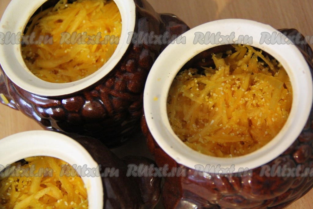 Выложить в горшочки слоями: тыква, крупа, тыква, крупа. Можно в одной миске соединить тыкву и крупу, хорошо перемешать, а затем разложить по горшочкам.