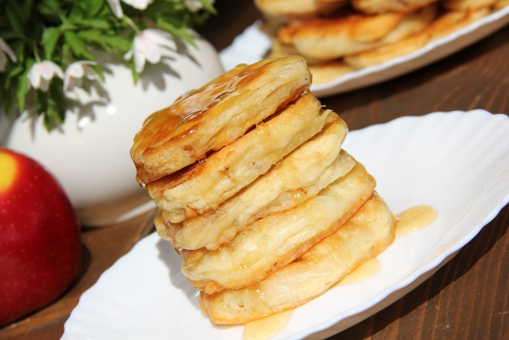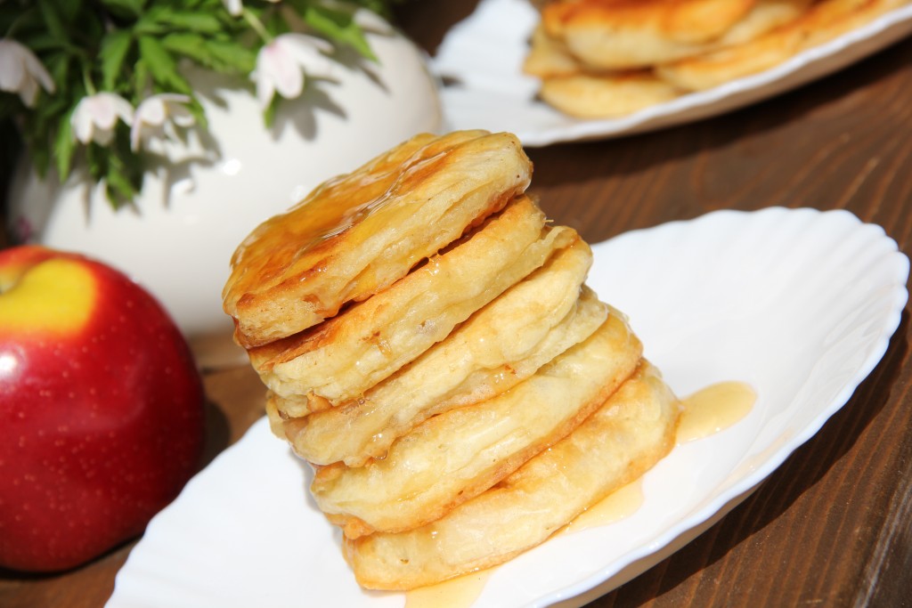 Готовые яблоки в кляре перекладывать со сковороды на бумажное полотенце (или на бумажные салфетки), чтобы убрать лишний жир, а затем выкладывать на тарелку. Постепенно пожарить все яблочные кольца в кляре. Аппетитные, очень вкусные яблоки, покрытые нежнейшим тестом, перед подачей можно полить мёдом или сиропом.