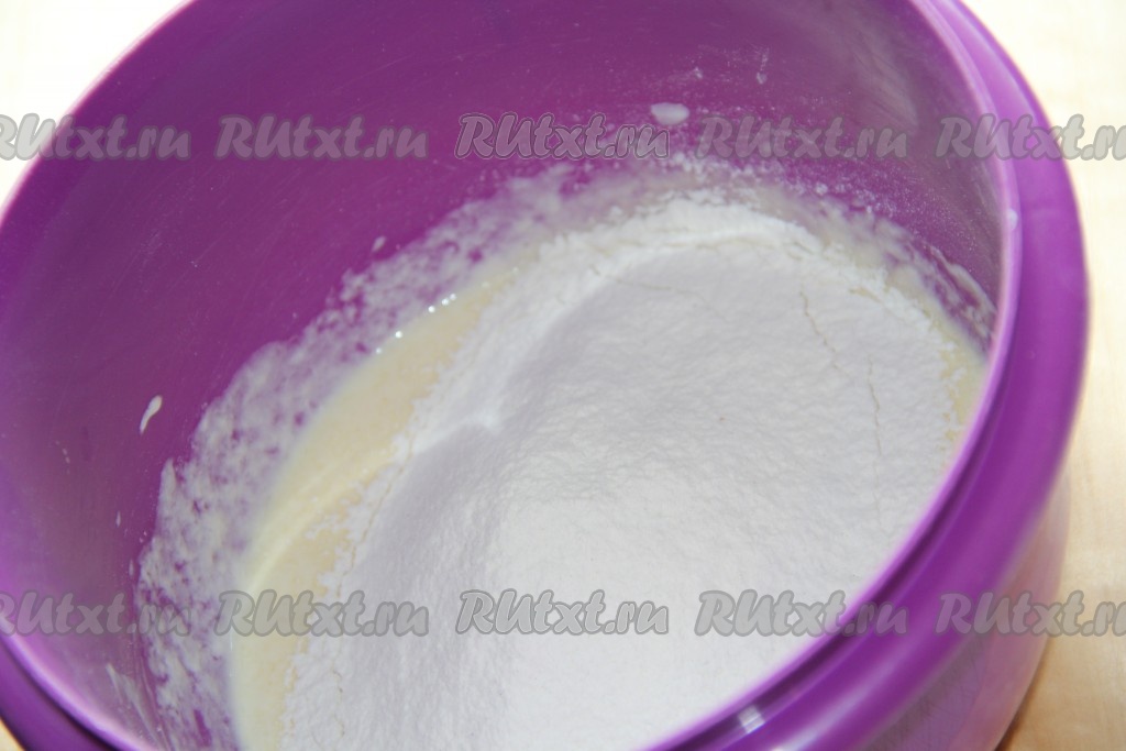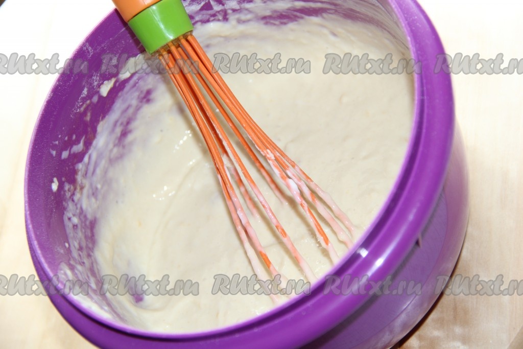 Постепенно начать всыпать оставшуюся муку и, тщательно вмешивая её венчиком, замесить однородное тесто, напоминающее достаточно густую сметану.