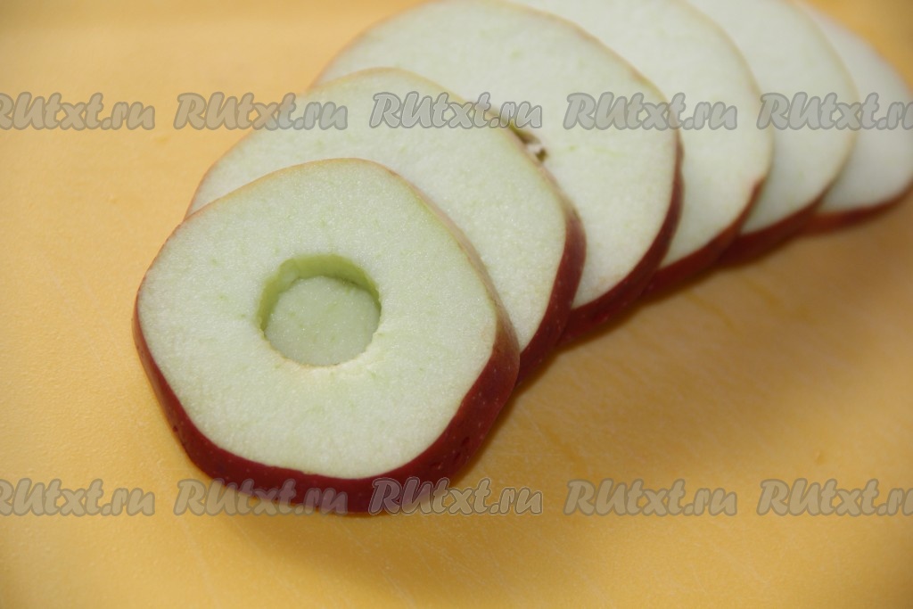 Яблоки вымыть, нарезать на кольца толщиной примерно 7 миллиметров, убрать сердцевину. Кожуру я не снимала.