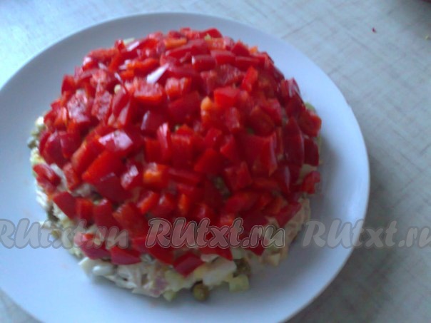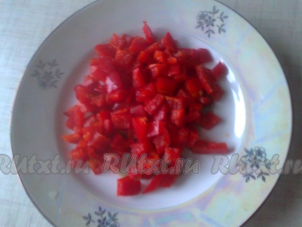 Равномерно выложить наверх нарезанные кубики болгарского перца.