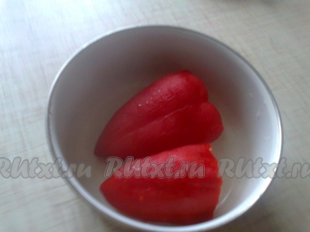 Замороженный болгарский перец разморозить в холодильнике в течение нескольких часов (но чтобы он остался твердоватым), сполоснуть холодной водой,