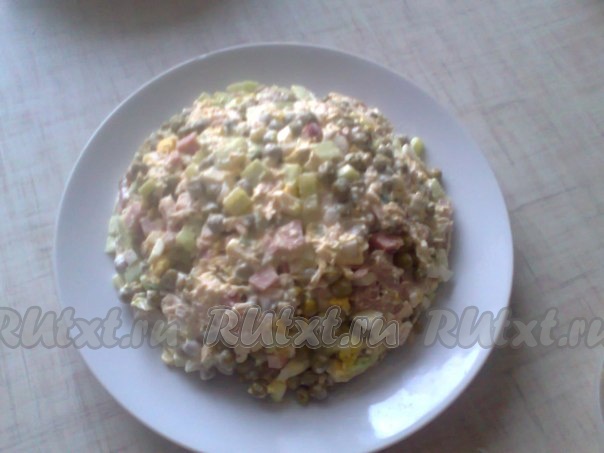 Смешать нарезанные мясо, яйца, горошек, огурцы, добавить густой майонез понемногу, перемешивая, чтобы салат не стал жидким. Выложить салат в посуду круглой формы, можно предварительно застелить пищевой пленкой (я не застилала) и хорошо утрамбовать.  Перевернуть салат на сервировочное блюдо.