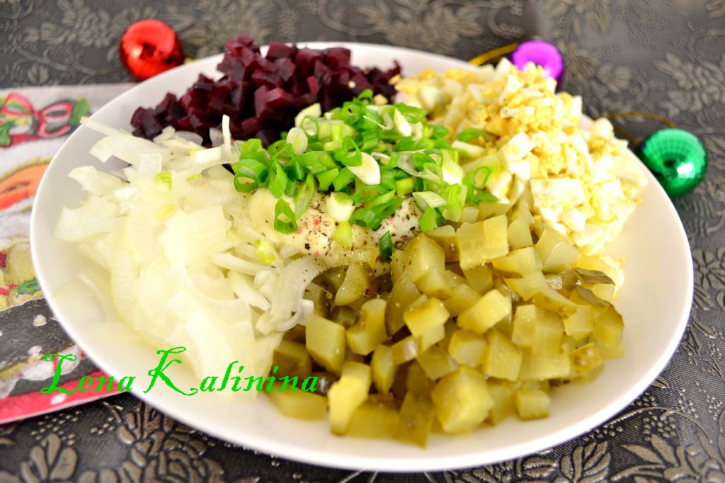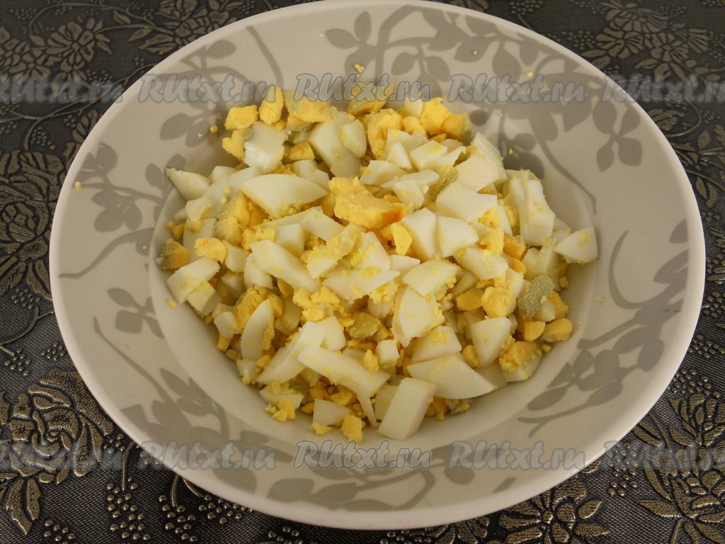 Свеклу и яйца отварить, остудить и очистить. Свеклу нарезать небольшими кубиками.