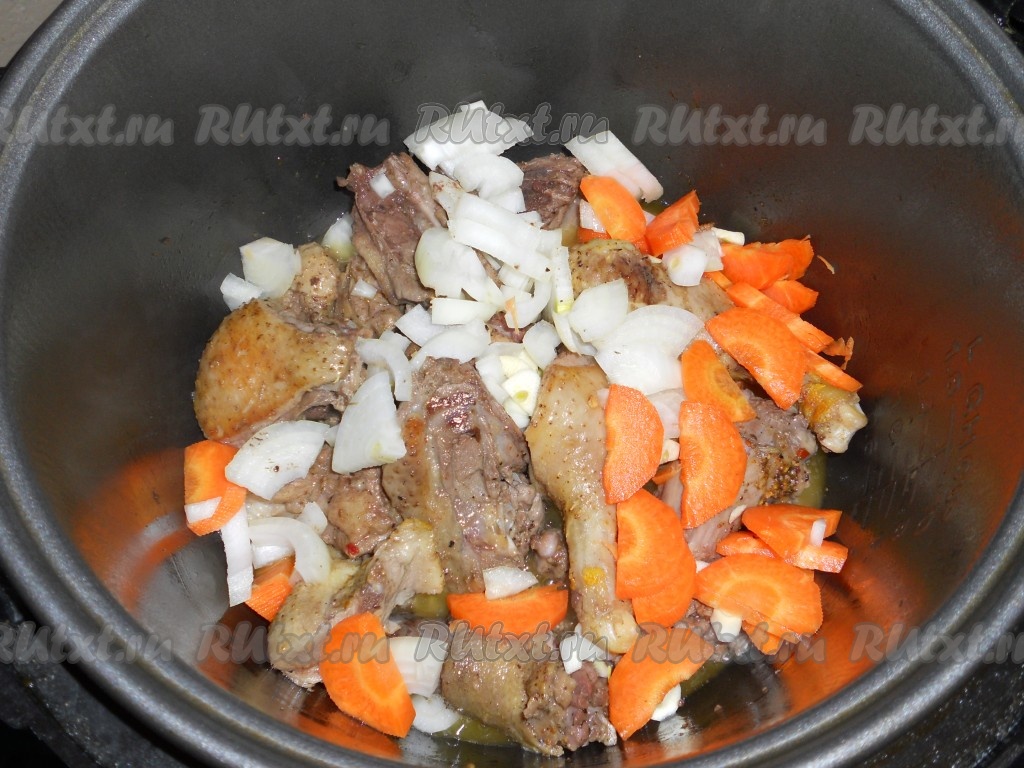 За это время утка поджарится и вытопится много жира. Этот жир следует собрать в баночку (пригодится для приготовления других блюд), в чаше мультиварки должно остаться приблизительно 100 грамм жира. Добавить к утке порезанные средними кусочками репчатый лук и полукружочками морковь. Также добавить порезанный чеснок. Снова выставить режим "Жарка" на 10 минут и готовить, периодически помешивая.