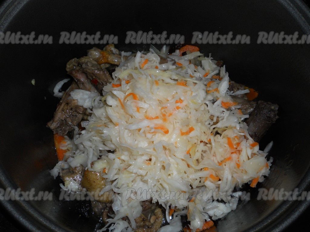 Добавить квашеную капусту в чашу мультиварки к утке, овощам и сухофруктам.